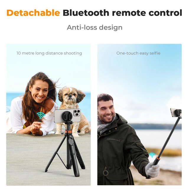 The 63-inch tripod offers 7-section leg adjustments, letting you shoot from low angles to full height with ease. Its magnetic phone mount snaps into place instantly for faster setups, while the integrated Bluetooth remote makes hands-free shooting simple and efficient. Built with a widened, reinforced structure and non-slip silicone pads, it stays stable on uneven ground and during long exposures.